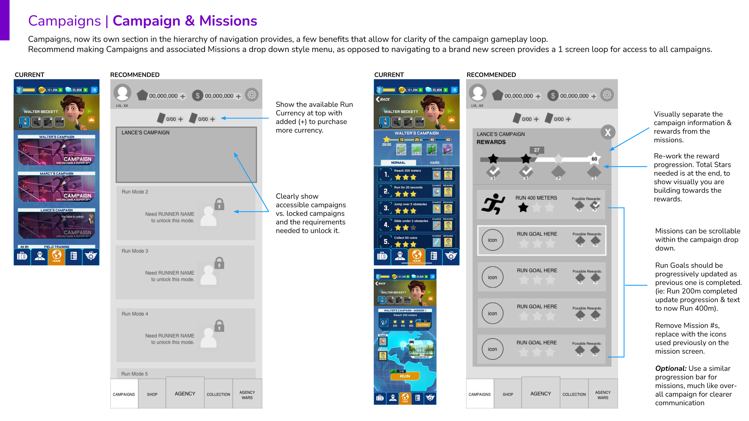 The 20th Century Games team reached out to me for some urgent help. They were working with a game dev partner who was creating a 3D Runner in support of the animated film Spies in Disguise. The game was going to be released in time with the film. The problem was that the team was so deep in the weeds on the game, that they were over-complicating their Design Systems and UX, which in turn really affected their gameplay and UI design. This was a huge lift on my end to reconstruct wireframes based on what was currently built in-game currently to help the team reach the finish line.