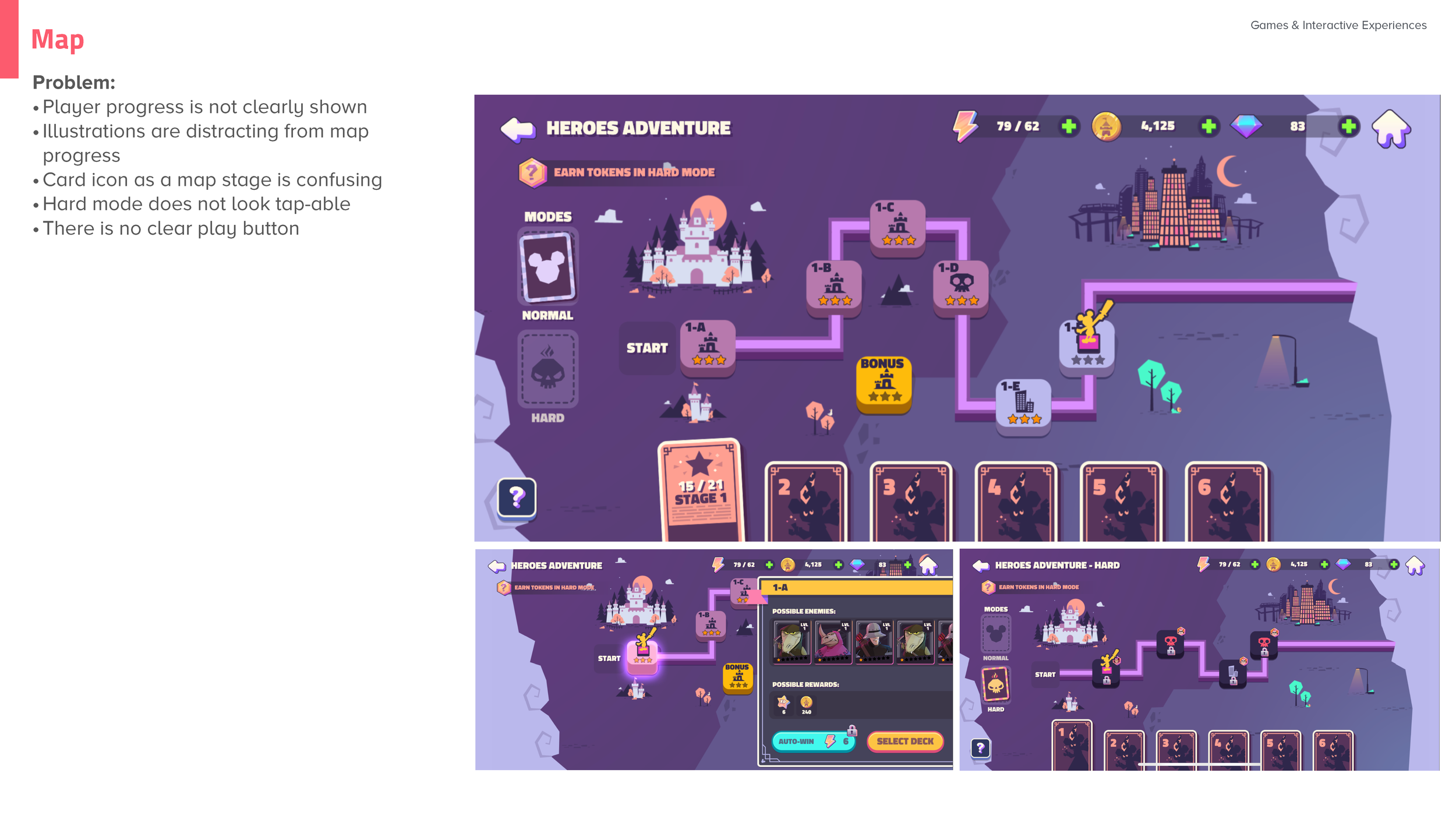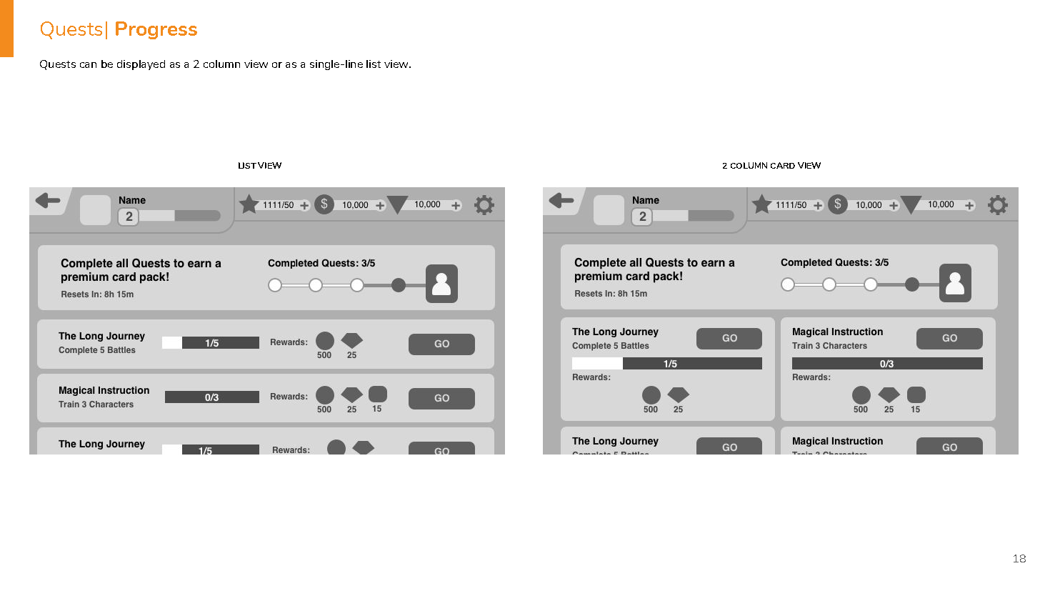 During the production of Disney Sorcerer's Arena the development team was struggling with reinforcing the core game loop in their UX, as well as upgrading characters for their RPG. In order to help point out these issues, I took on the task of wire-framing various sections of the game to explain and show the team how we can reinforce the goals we set out.
